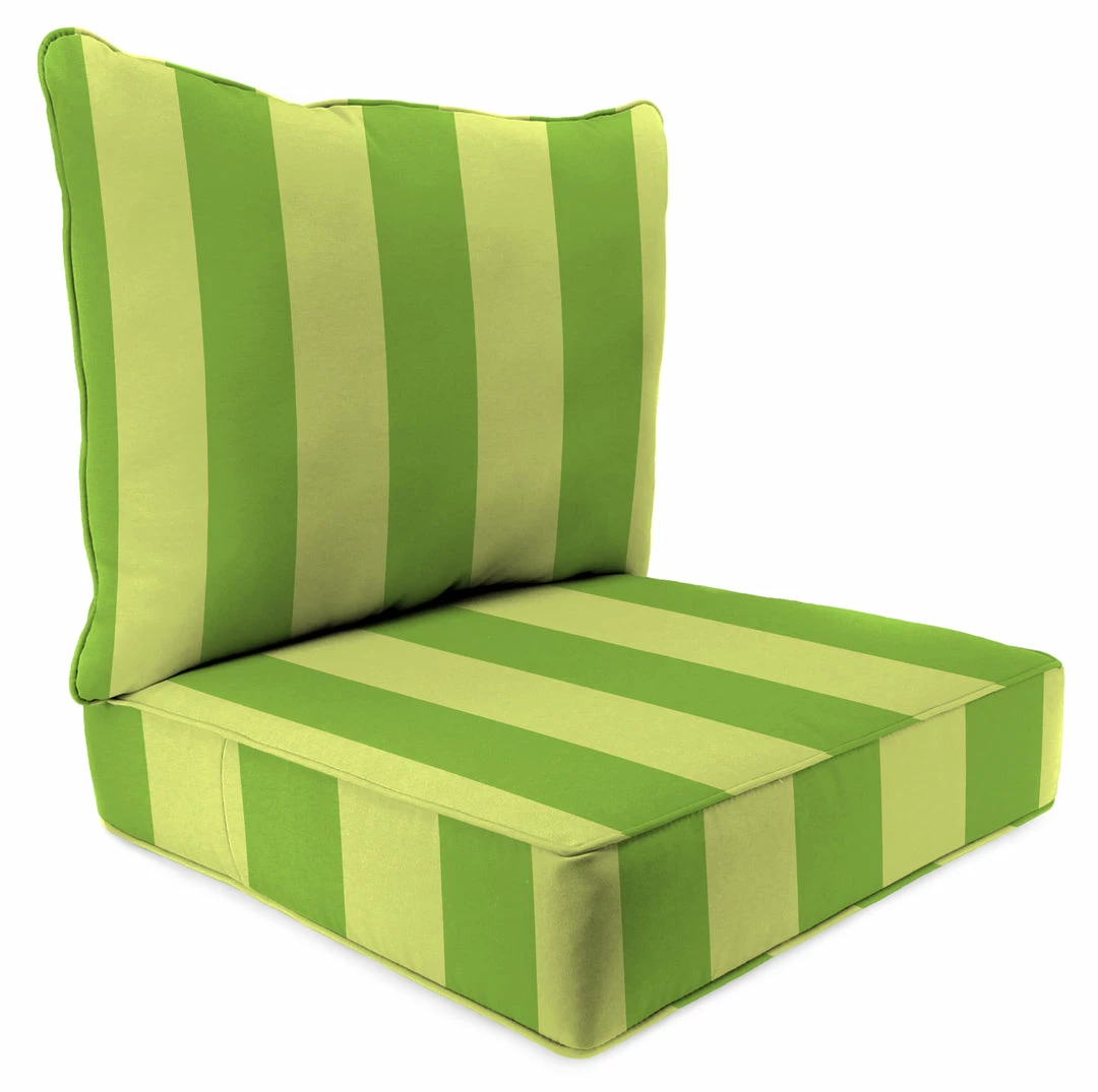 Refresh your outdoor seating arrangement with the comfort and style of this 2-Piece Outdoor Deep-Seat Chair Cushion Set from Jordan Manufacturing. Covered with a soft fabric and filled with high-density foam and fiber material, the deep-seat chair and back cushion are specially designed to keep you lounging comfortably on your favorite patio chair. Crafted from fade-, UV-, water- and stain-resistant fabric to withstand the elements and maintain the quality of your cushions over time Bringing a stylish look to help enhance your patio, deck, or pool area.