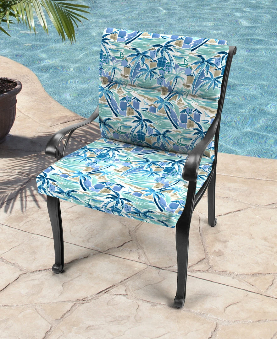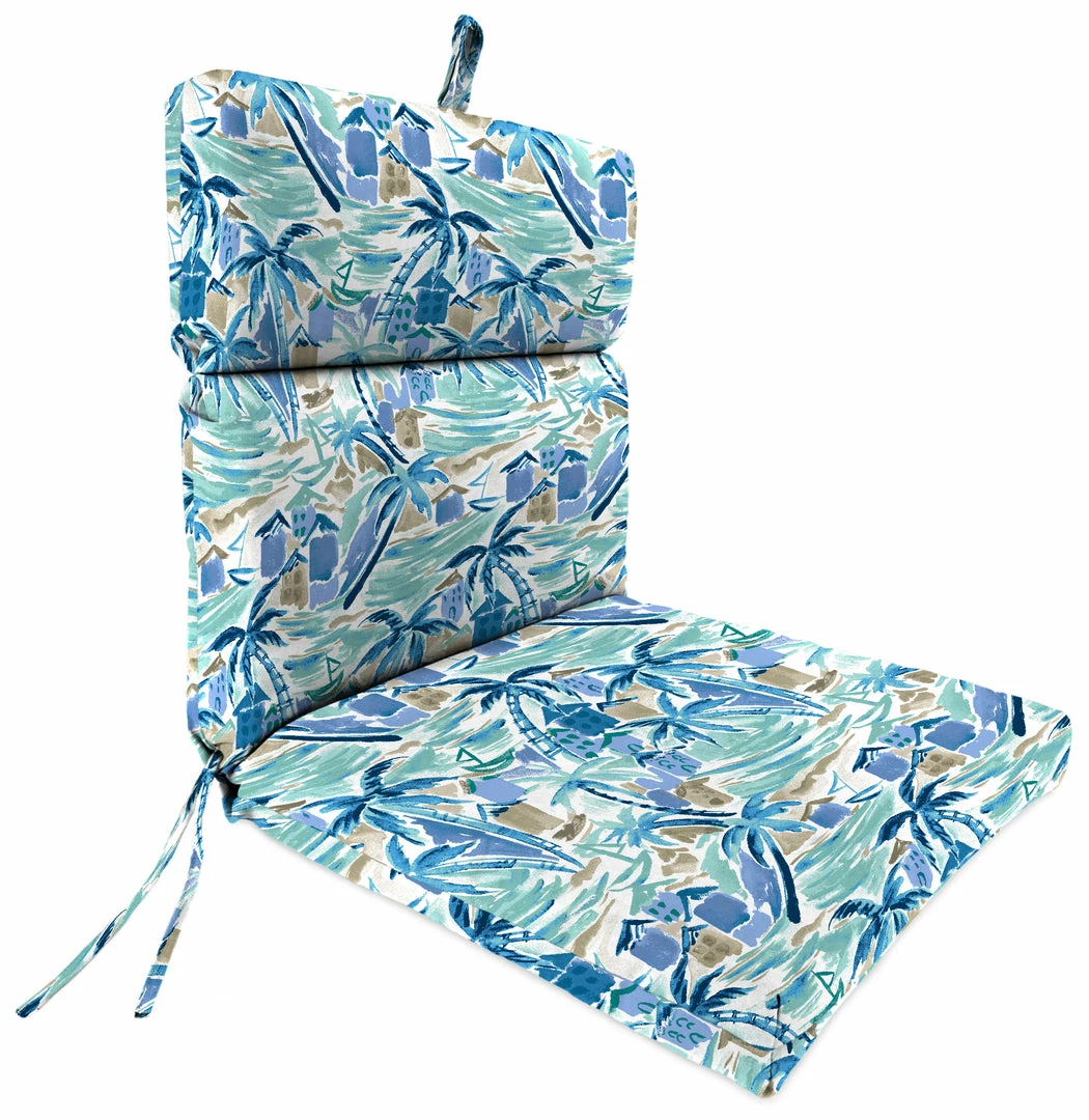 Outdoor French edge dining chair cushion; UV protection allows cushion to withstand up to 500 hours of direct sunlight; Filled with dense hypoallergenic layered fiber; Weather resistant polyester fabric that is engineered to withstand mold, mildew, & stains; Overall dimensions: 22Wx44Lx4H; Seat dimensions: 22Wx22L; Back dimensions: 22Wx22L with 9.5″ head hinge; Matching ties for a secure fit and hanger loop for easy storage