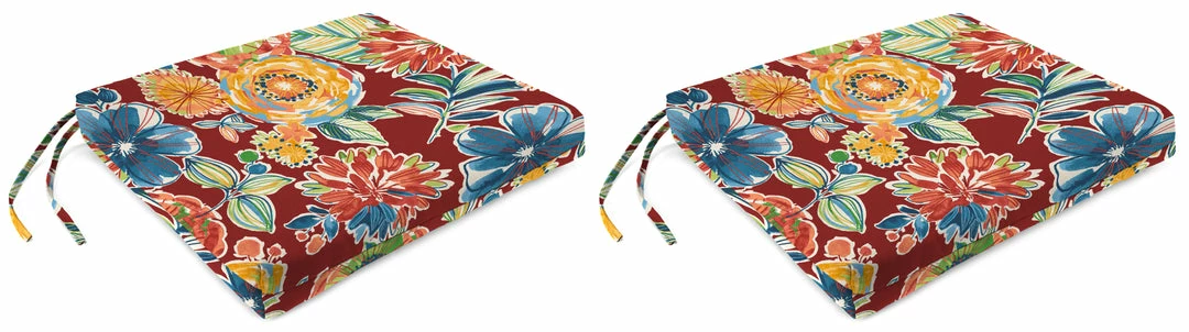 Bring optimal comfort to your patio chairs with the French Edge Seat Cushion from Jordan. Sold in sets of 2, these cushions are made with weather-, water-, fade- and UV-resistant fabric for ultimate durability and long-lasting use. They are stuffed with hypoallergenic polyester fiber fill for an extra cushy and soft experience while relaxing. Ties along the sides add convenience while ensuring the cushions stay in place when you’re sitting down. From elaborate dining spaces to cozy three-season porches, these fiber-filled cushions boosts your space with carefree, laid-back style and total comfort.