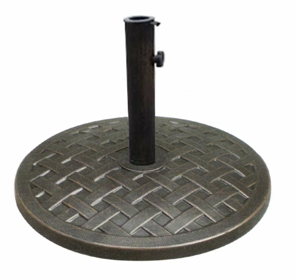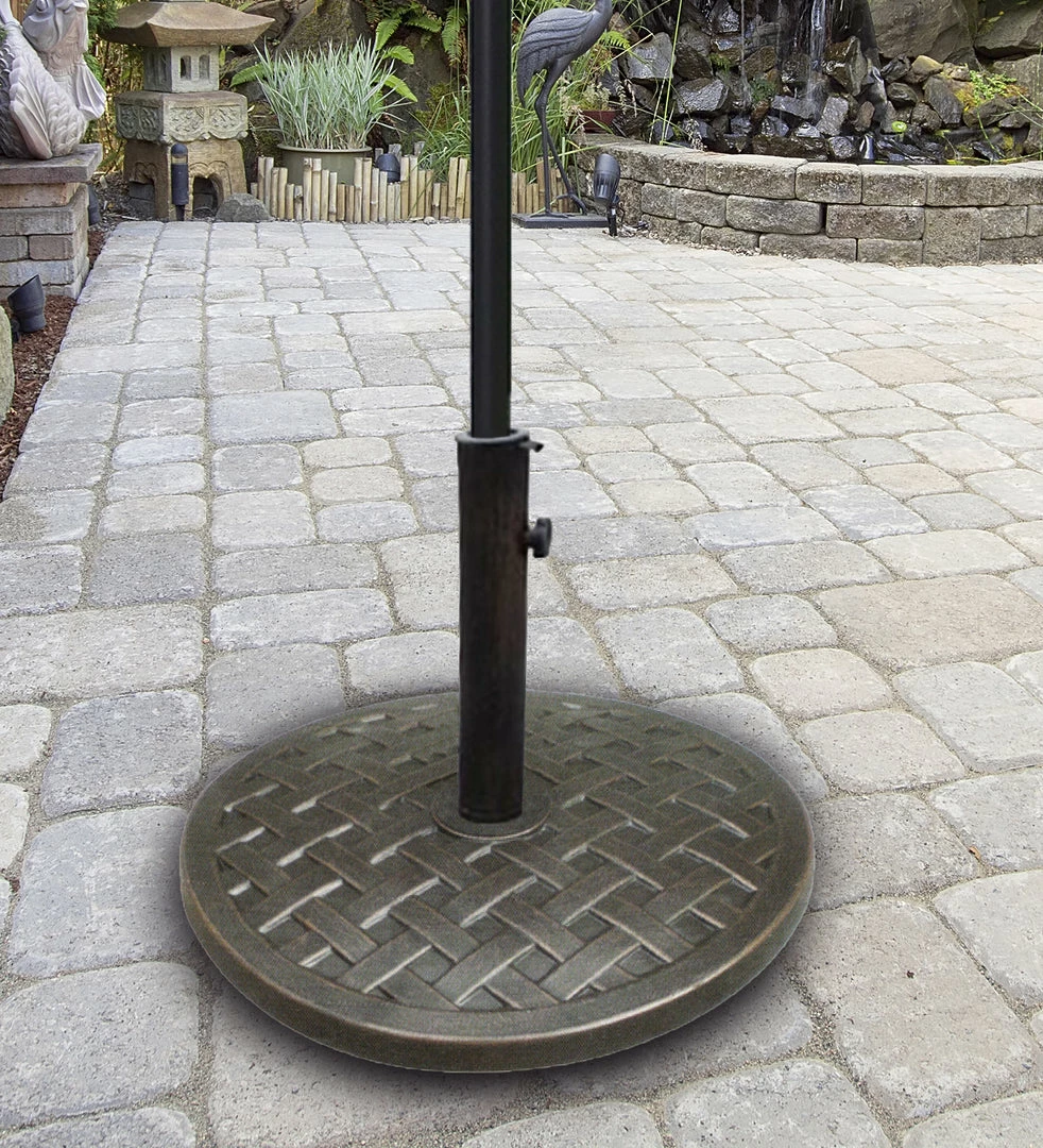 Complete any outdoor patio area with our decorative polystone round umbrella base. Great accent piece to pair with our steel market umbrella. Comes with an adjustable steel tube that fits most outdoor umbrella frames.