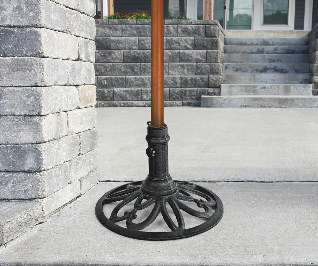 Complete any outdoor patio area with our decorative cast iron round umbrella base. Great accent piece to pair with our steel market umbrella. Comes with an adjustable cast iron tube that fits most outdoor umbrella frames.